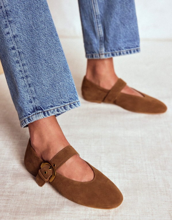 These flat buckle suede Mary Janes are going to sell out. Also available in red leather and ivory leather.