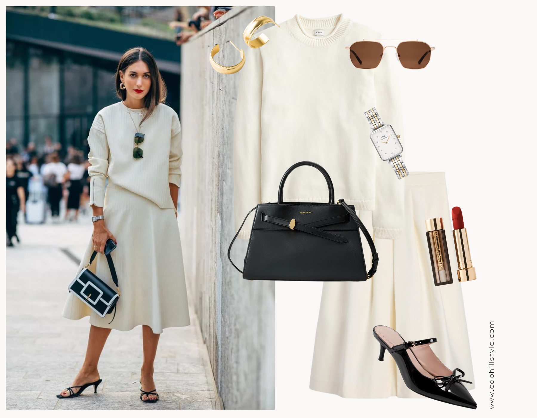 This street style photo found on Pinterest really embraces mixes elegance and ease. It feels so effortless, yet so feminine and put together. Here’s how to recreate it.