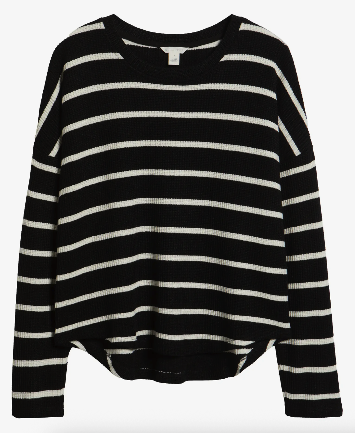 Yes, this is stripes two days in a row, but this long-sleeve waffle knit tee is perfect for fall. Wear it alone with leggings, jeans, olive pants, or wide leg lounge pants. Add a puffer vest, a utility jacket, a short trench, or a slim-fitting button-up under neath for a great layered look.