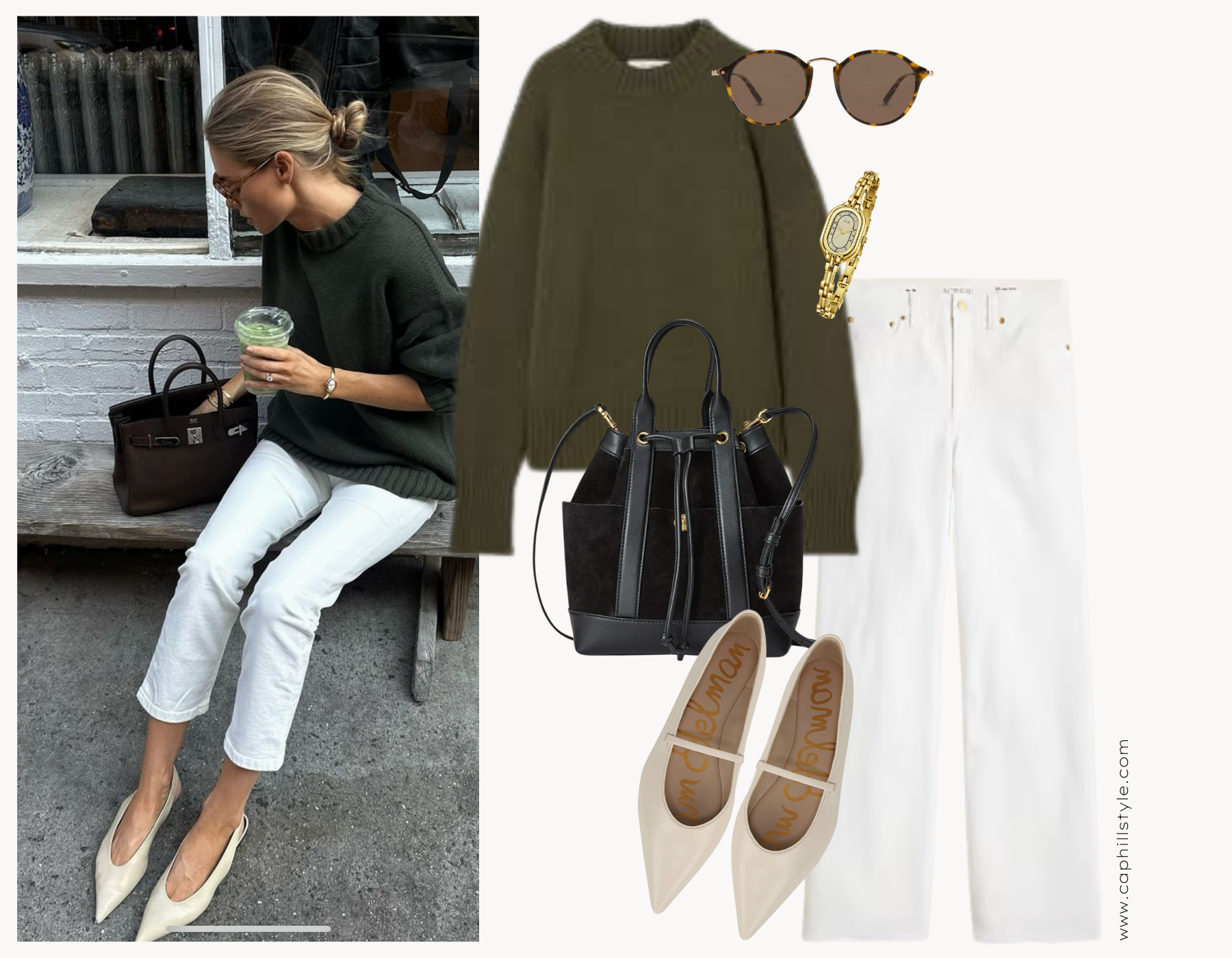 The Jeans // I spotted this look on Pinterest and knew immediately that we were going to need to talk about white denim for fall again. If you are only wearing white denim in the summer, do not mothball them for cold weather. Mixed with sweaters, blazers and layered looks, white denim looks crisp and stylish. It is an IT GIRL look.