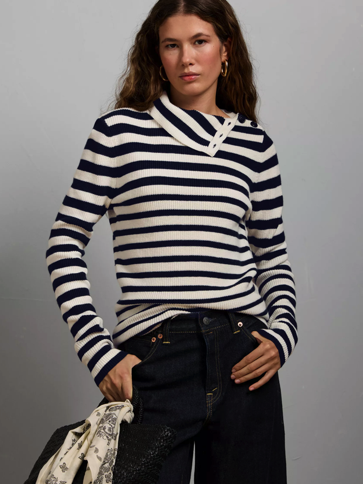 I ordered this Shaker Stitch foldover sweater because I can’t resist a stripe. I am hoping it looks as good with black wide legs as I am hoping it will. I really need a medium-dressy sweater to wear to work on causal days.