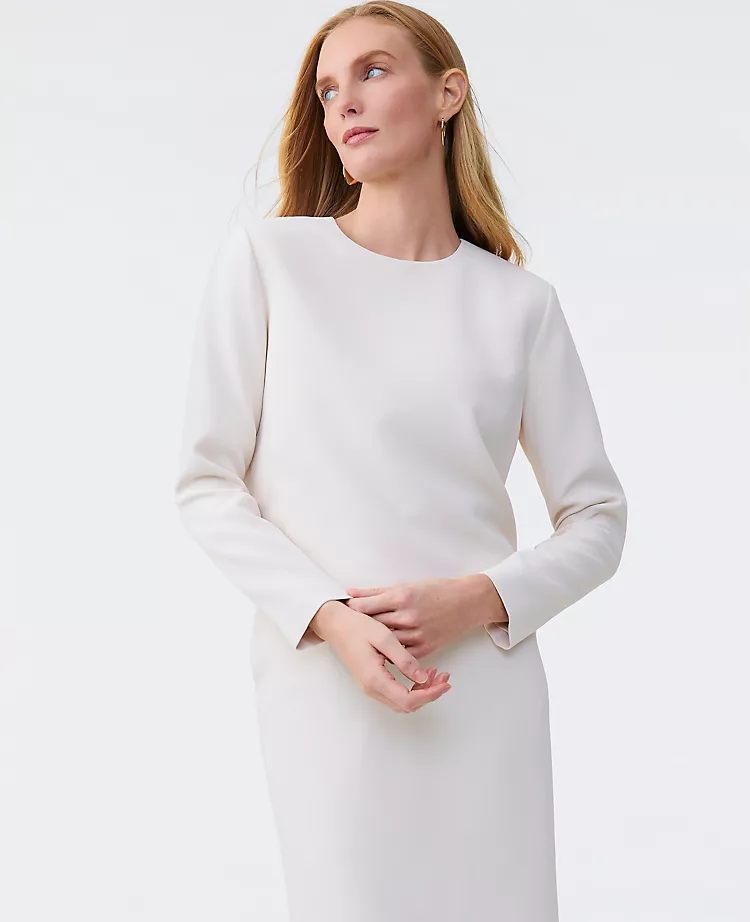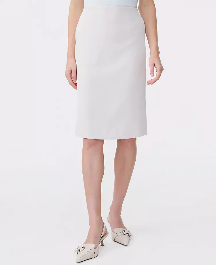 Wearing the top with the pencil skirt looks like a popover dress. However, if you prefer pants, they also make a crepe pant in the same ivory hue.