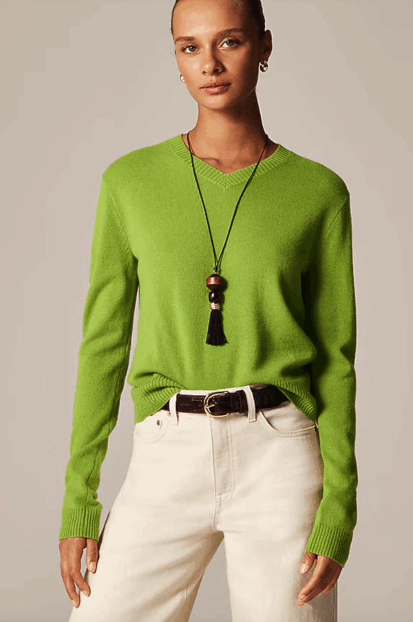 The green in this J.Crew sweater picks up the green in the blouse. Just make sure to foldover the sleeve and cuff so that you get a bit of the pattern peeking out at the wrists. It balances out the floral pattern at the collar.