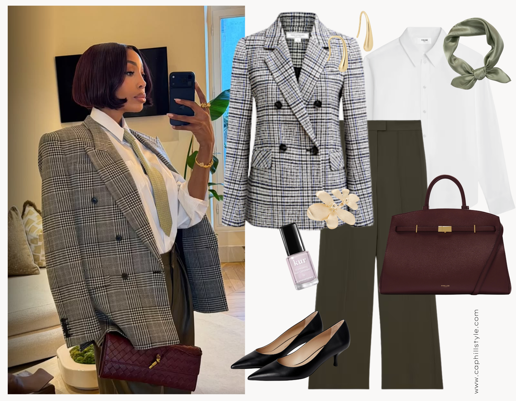 Several of my colleagues in Washington occasionally wear ties with their suits. It’s such a chic look, but I just don’t think I can pull off. Then, I see someone, like the woman in the photo really making it work, and I get a little jealous. But even if the tie is not for you, the color palette should be — the olive, peridot, and burgundy look so chic. Let’s rebuild it.
