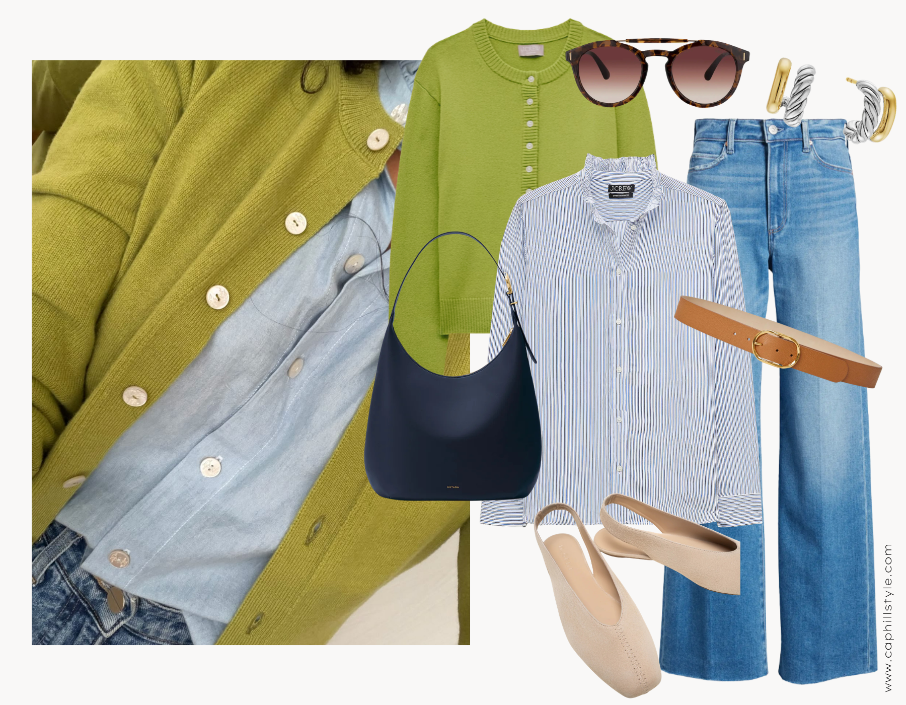 Tuckernuck has a slightly shorter style in a pear green. MM LaFleur has a v-neck style in this color. For something under-$50, Amazon has this waist-length cardigan.