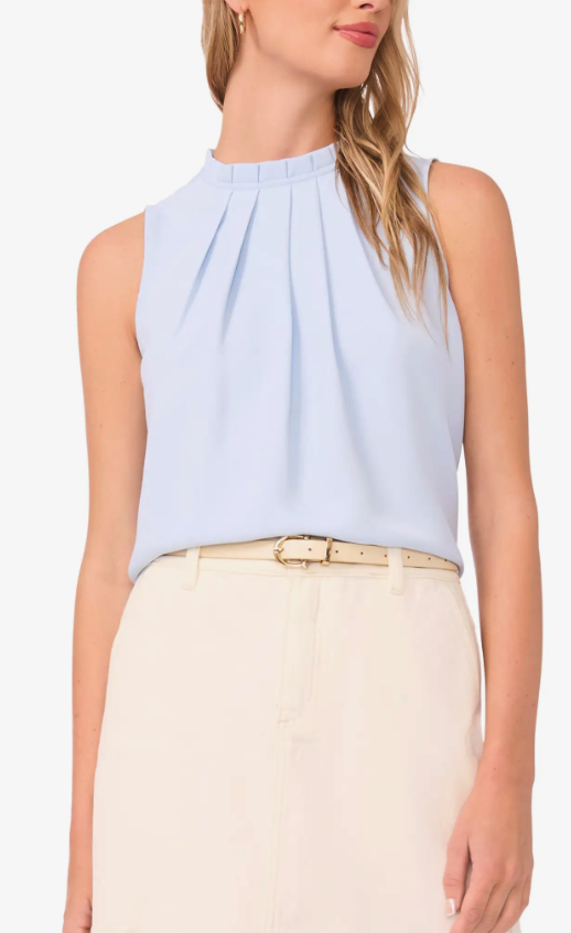 A sleeveless shell is a great under layer. The sleeves are wide enough to cover bra straps, but the look is summery and won’t add bulk to the arms. This one from Vince Camuto has a great pleated neckline and comes in four great colors. This light blue pairs well with navy.